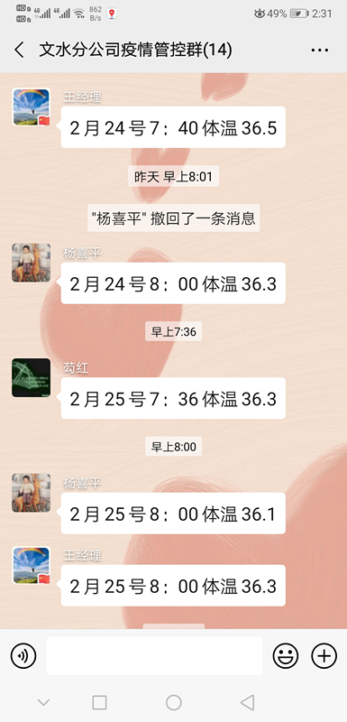 3、利用微信建群,做好公司疫情信息的搜集統計與分析工作,每日報告體溫由專門負責人統計信息并報送總公司、業主、當地有關部門。