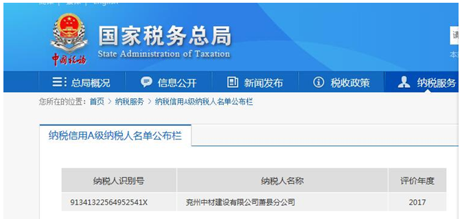 2018年6月15日,經過在國家稅務總局官方網站查詢得知:兗州中材建設有限公司蕭縣分公司被評定為“A級納稅信用企業”。