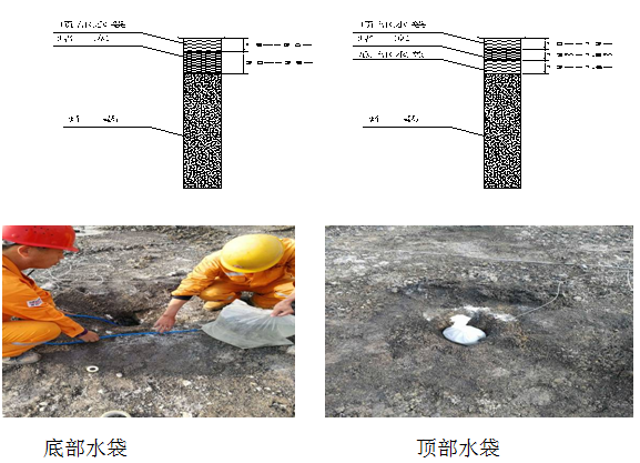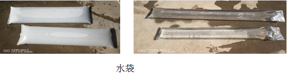 以上單水袋、雙水袋的設置位置是在裝藥完成之后,在堵塞段中考慮設置的水袋位置。底部水袋:是指自裝藥完成后,在堵塞段的底部安放的水袋,其水袋與炸藥緊密接觸,水袋安放注水后再行填塞;頂部水袋:是指在填塞的最后時,預留一定的空間安放水袋;水袋注水后都是填塞的一部分,與填塞形成一個整體。